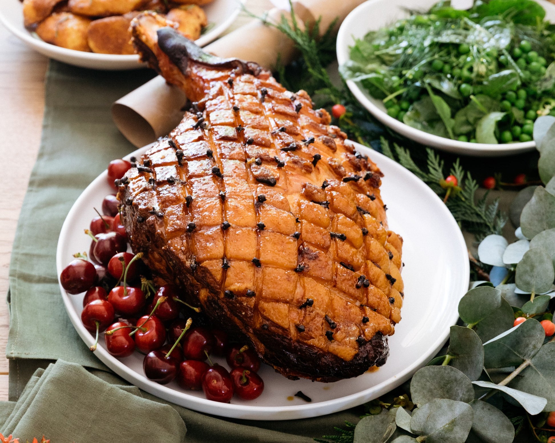 Premium half leg Berkshire ham with rich maple glaze, ready to prepare and bake at home for festive feasting! Product image is illustrative.
